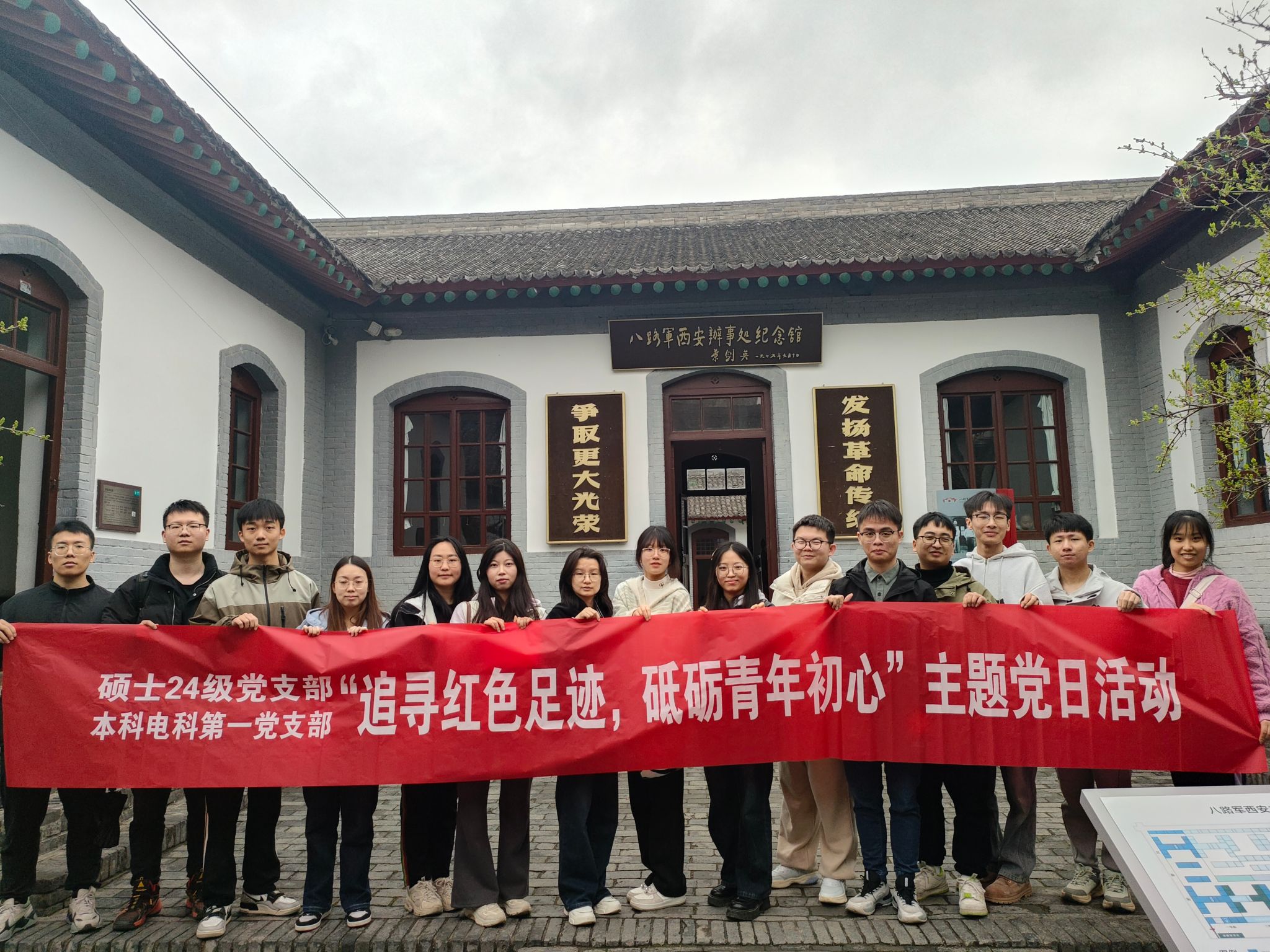 本科电科第一党支部、硕士24级党支部联合马克思主义学院“青”声“习”语研究生宣讲团通过主题宣讲与实践研学相结合的方式,围绕学习八路军西安办事处纪念馆的红色历史文化和革命先辈英勇事迹,开展“追寻红色足迹,砥砺青年初心”主题党日活动,20余名学生党员参与本次活动。