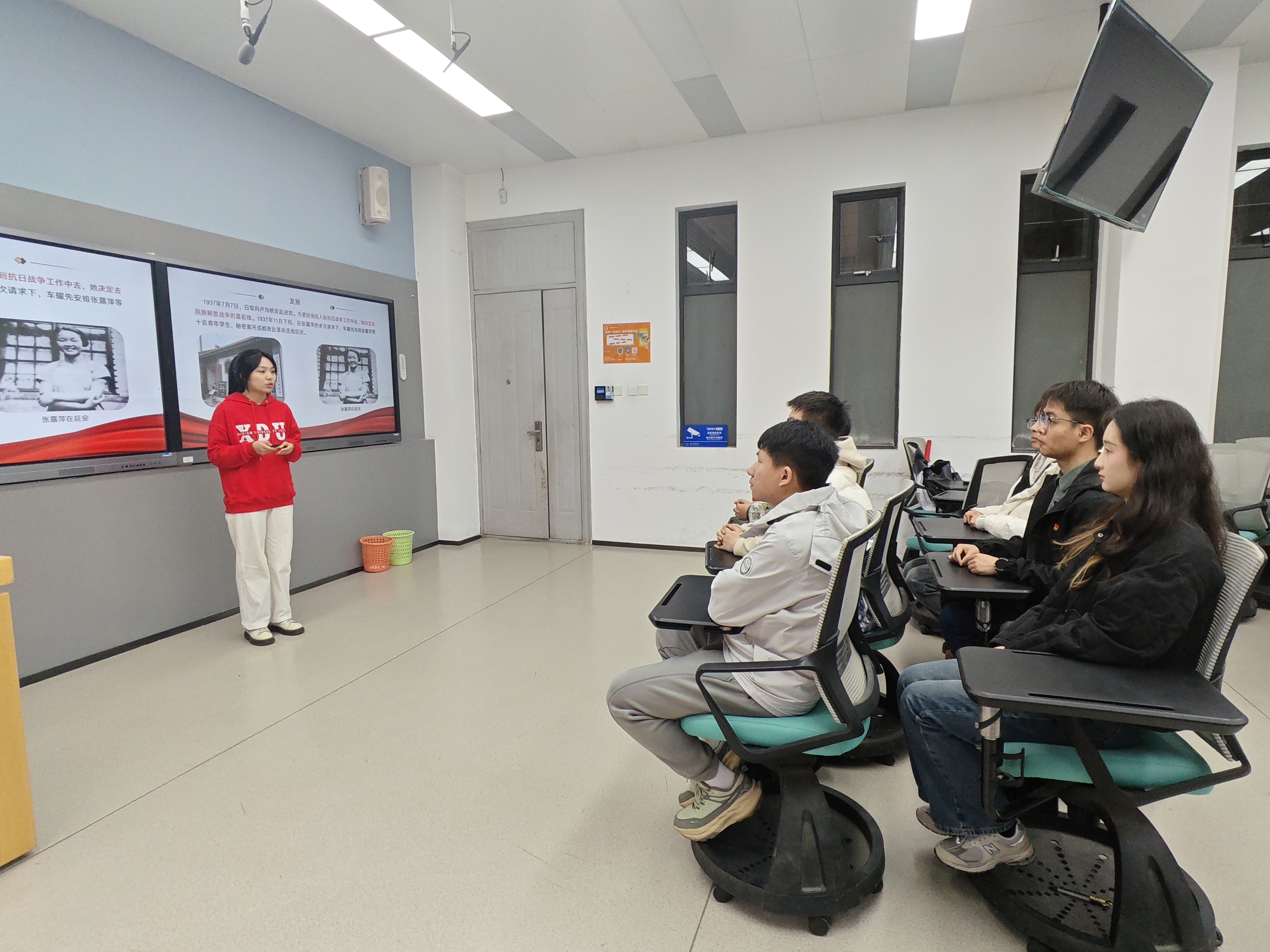 学生党员开展“场馆里的思政课”主题宣讲,以巾帼英雄张露萍生平为主线,讲述了这位女共产党员的生平和她保护党内情报机密,不畏强暴、英勇就义的先进事迹,宣讲中,两位宣讲团成员通过配音表演再现张露萍狱中坚贞不屈的场景,对西安“八办”精神进行了系统而深刻的讲解,同学们对中国人民打赢抗日战争的坚定决心和不畏艰险的顽强意志有了更深刻的理解。
