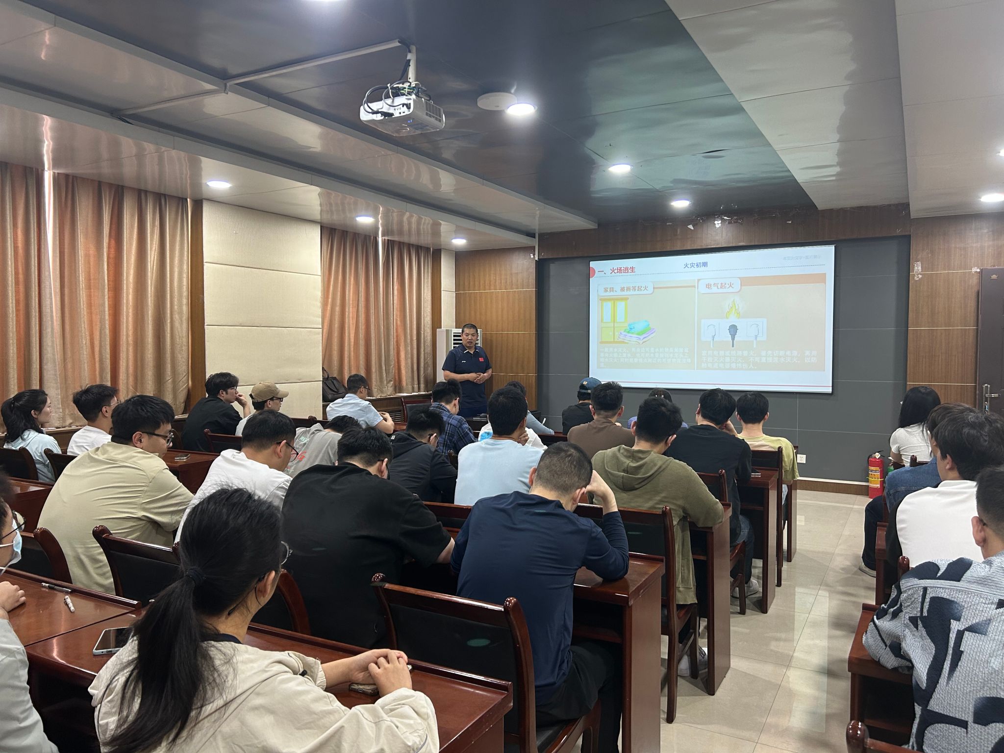 随后,校消防站史凯源老师结合真实案例详细讲解了火灾预防、火情识别、灭火的基本方法以及火场逃生要点,同时结合学院实验室安全管理的实际情况,重点讲解了实验室安全疏散及危险化学品泄漏事故的应对方法。他强调,进入公共场所应首先熟悉安全出口和疏散路线,做到心中有数,当火灾发生时务必保持冷静,谨记“小火快跑,浓烟关门”应急要领,在疏散时应注意防护避免摔伤。学院师生应时刻保持警惕,强化消防安全意识,坚持“安全第一,预防为主”的原则,将消防安全隐患消除于萌芽状态,做到防患于未然。