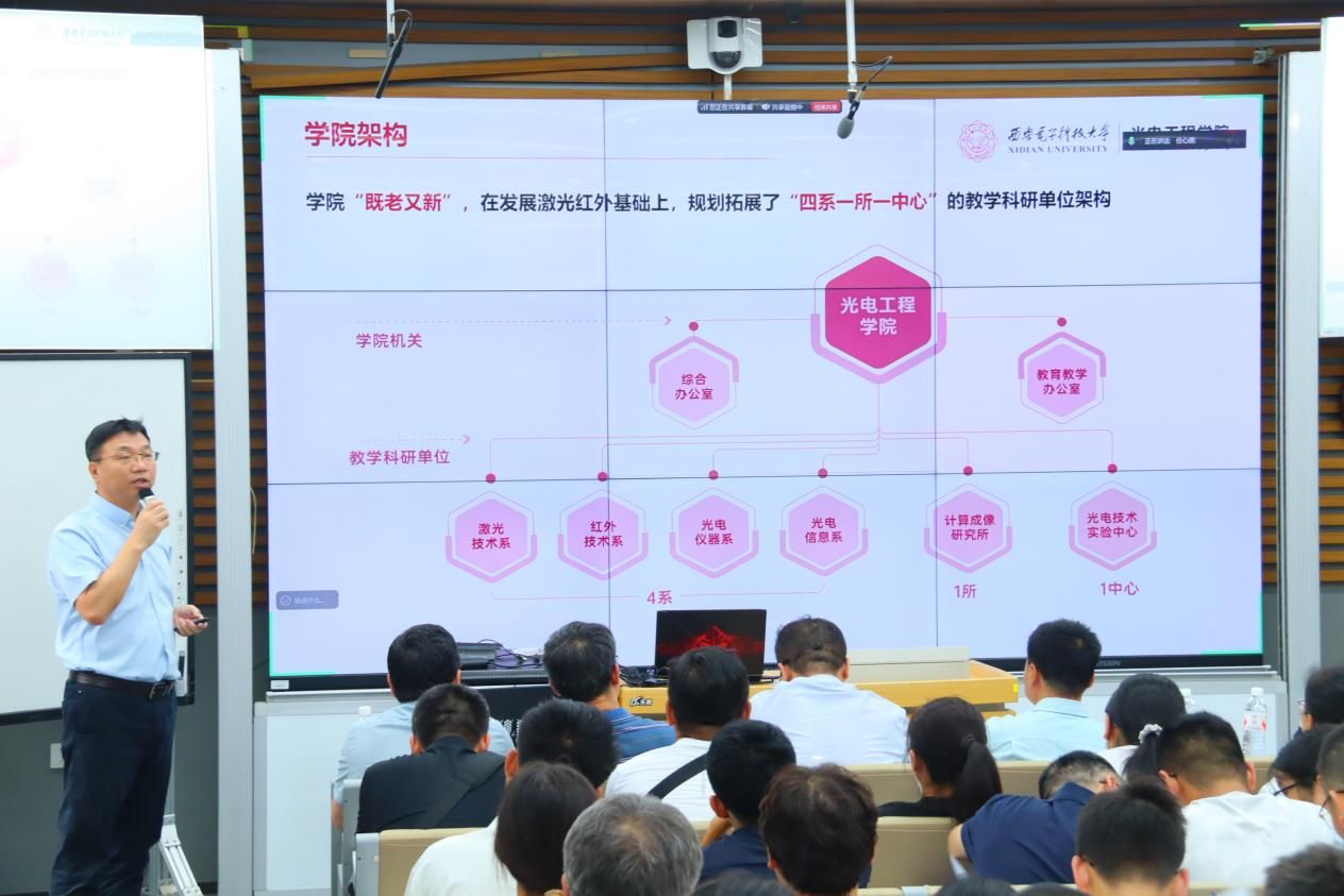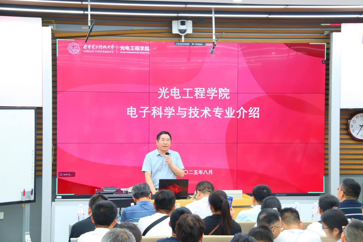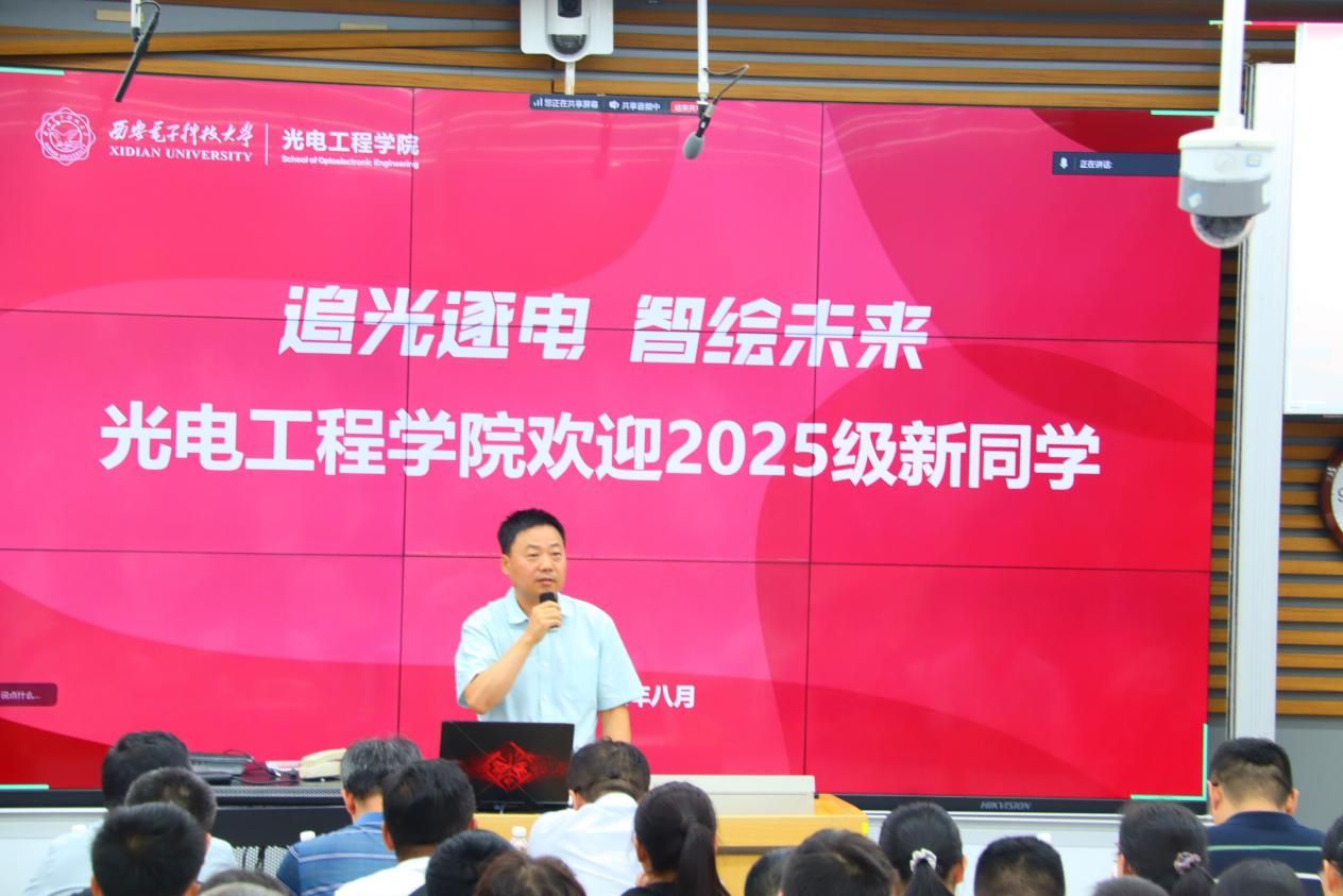 院长徐淮良对学院的发展沿革进行了简要回顾,并详细介绍了学院的师资平台、人才培养、学科科研以及教育管理等情况,着重强调了学院8个科研团队的研究方向及其科研突破。他指出,光电技术在当代科技发展中作用显著、未来前景广阔,希望同学们利用好学院提供的科研平台与学习资源,树牢科技报国志向,勇于探索未知,承担起新时代西电人的责任使命。
