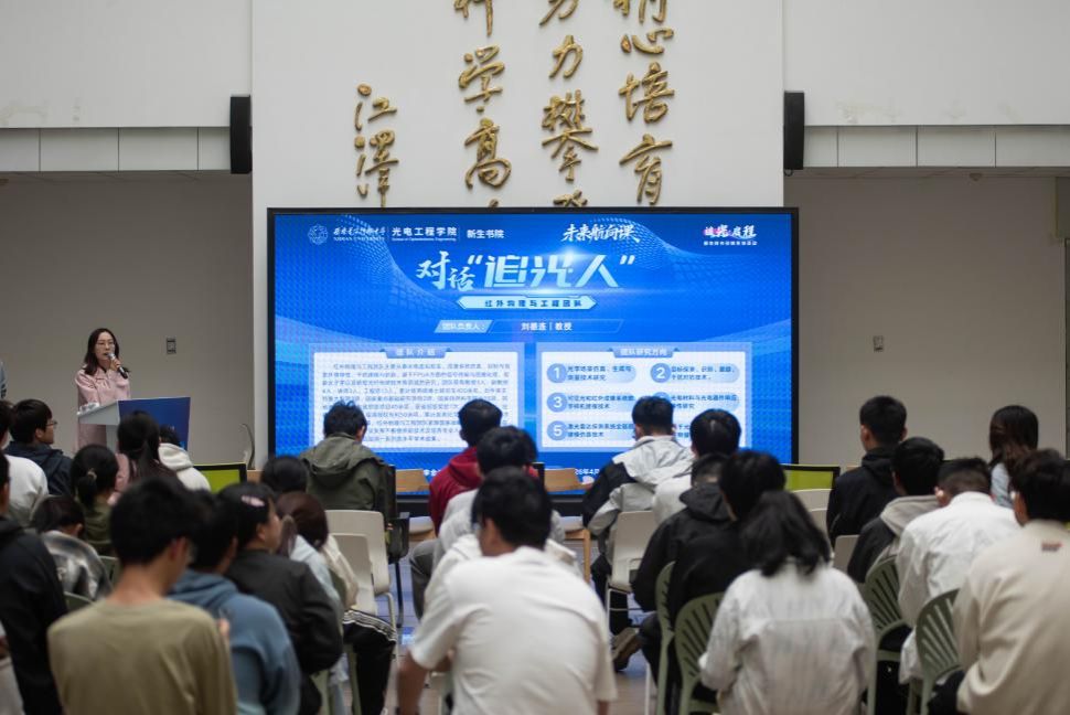 联合新生书院持续推进“追光·启程”系列活动——对话“追光人”。4 月8日下午,第二期“对话‘追光人’”在海棠 5 号楼大厅举行。红外物理与工程团队与近百名电子信息大类新生共探光电奥秘。