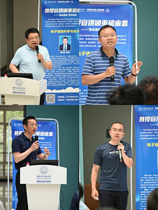 推介环节中,周慧鑫教授从“物理改变世界,光电引领未来”出发,介绍了学院整体概况、电子科学与技术专业内容、科研团队和研究方向等情况;郭立新教授主要讲述电子信息科学与技术专业起源、专业特色、学科支撑,与电子科学与技术的关系和区别,已取得的重大科研成果,以及承担的国家科技重大专项、国家973、863课题及应用情况;朱江峰教授介绍了光电信息科学与工程专业课程体系、毕业生去向、人才培养特色、科学研究方向及其应用等,还阐述了光学工程未来的发展前景;弓树宏教授以电波传播与天线作为信息时代发展的桥梁、纽带为主线,介绍了人才培养的根本任务,提出“西电一家亲,专业互支撑”,鼓励同学们结合自己实际做出正确选择。在浓郁的双院育人文化氛围中,四位教授精彩的演讲赢得了同学们经久不息的掌声!