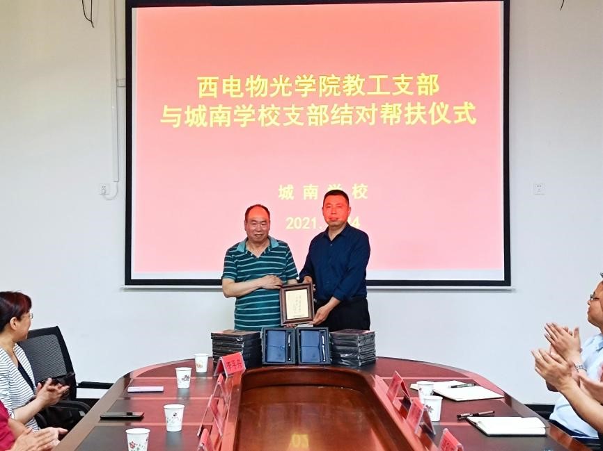 邵晓鹏代表学院向城南学校捐赠善款,用于学校建设和学生帮扶。李平舟代表物光院教工党支部向城南学校党支部捐赠毛泽东主席为西电题词“全心全意为人民服务”主雕塑纪念品和学习物资,开启两校党支部结对共建新篇章。黄军荣、辛红邀请城南学校师生来西电参观交流,感受“学在西电”浓郁学风和多彩大学文化。武颖丽介绍了物理实验中心正在承办的中国大学生物理学术竞赛西北赛的筹备进展以及历年取得的优秀成绩。