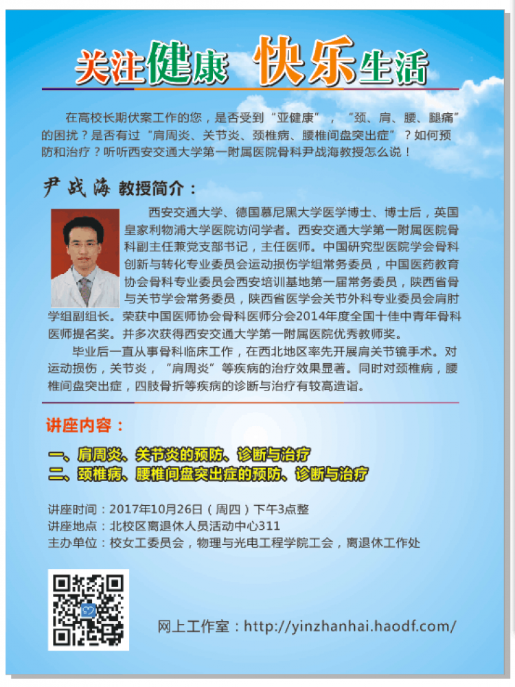 工会主办,并在校女工委员会、校离退休工作处的大力协助下,特邀请西安交通大学第一附属医院骨科室副主任尹战海教授,为在高校长期伏案工作的您排忧解难:让受到过“亚健康”, “颈、肩、腰、腿痛” 困扰;让诊断为“肩周炎、关节炎、颈椎病、腰椎间盘突出症”的您,今后能轻轻松松,健康生活!